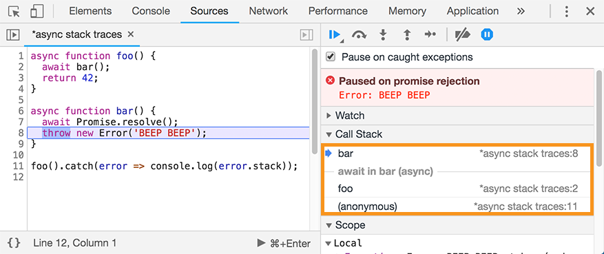 However, if you compare this to the async stack trace in Chrome DevTools above, you’ll notice that the actual call site to foo is missing from the asynchronous part of the stack trace. As mentioned before, this approach utilizes the fact that for await the resume and suspend locations are the same — but for regular Promise#then() or Promise#catch() calls, this is not the case. For more background, see Mathias Bynens’s explanation on why await beats Promise#then().